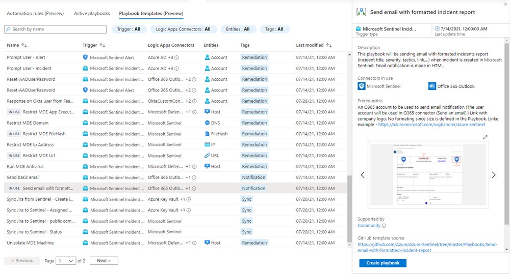 Microsoft Sentinel is a SIEM and SOAR solution ideal for businesses with an existing Microsoft or Azure Cloud ecosystem. Its automation rules allow teams to tag and close security incidents and develop task lists for security analysts to use when investigating and remediating threats. Playbooks are collections of actions based on workflows that you build in Azure Logic Apps. You can configure playbooks to automatically run when initiated by a particular alert or incident.