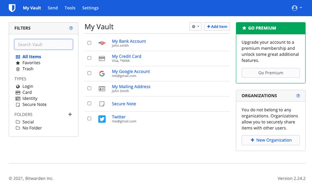 Bitwarden is a secure password manager that stores, manages, and shares sensitive online information such as passwords and credit cards. It includes Bitwarden Send for encrypted data transmission, which ensures end-to-end security. It complies with GDPR, SOC 2, HIPAA, and more. Bitwarden provides a full-featured Teams edition with unlimited users, IAM connectivity, and local hosting options starting at $4.00 per user per month, with a seven-day free trial.