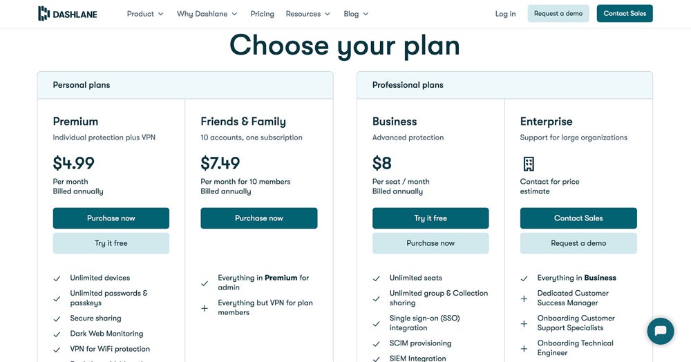 Dashlane has Starter and Business tiers targeted at different business sizes. Premium includes VPN integration for individual users and Business users gain a free family plan and SSO support. Dashlane has recently consolidated its price tiers, offering a starting tier for up to ten users and a business tier with unlimited users and additional capabilities. Contact their sales team to customize your Enterprise plan or request a free trial.