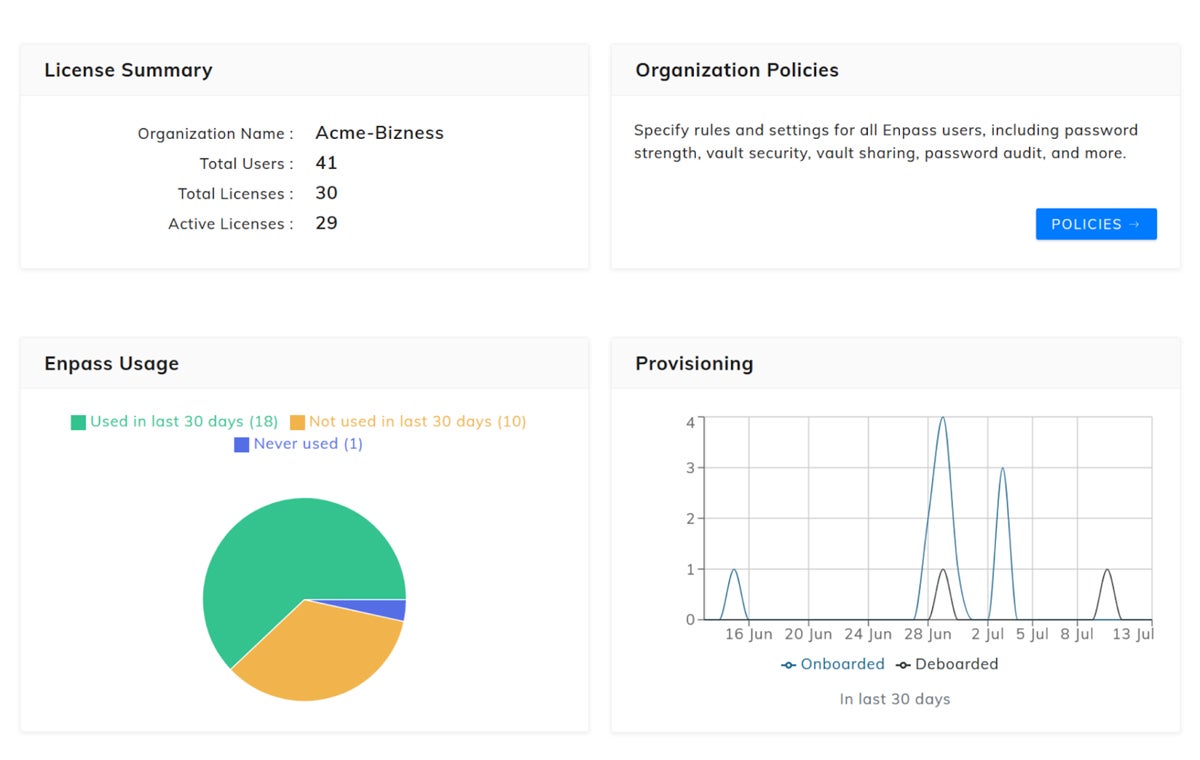 1Password delivers similarly useful group sharing, integration, and reporting features. It further empowers administrators with graphical dashboards to provide information at a glance to efficiently manage large numbers of users. For Business license customers with more than 75 users, 1Password also includes guided migration support. 1Password doesnβt support self-hosted vaults, but this permits faster set-up and deployment.