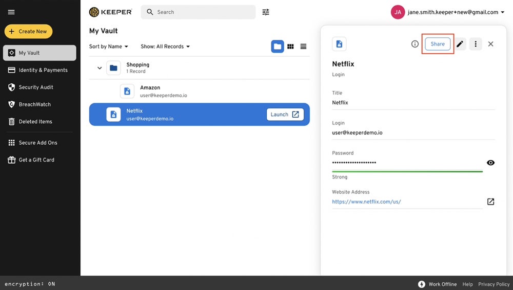 Through password sharing in Keeper, you can specify whether the new user can edit, share, or own the shared item. Keeper also allows temporary password sharing — IT admins can configure a specific time the share is active. This is particularly useful for third parties like contractors and business partners who only need access to an application for a few hours, a day, or a weekend.