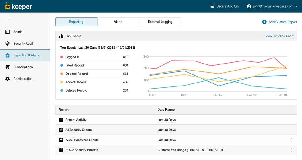 Keeper provides activity reporting for users’ activity within the password manager. But if your team wants enterprise-grade reporting options, Keeper also offers an add-on module for advanced reporting and security alerts, as well as an add-on for compliance reporting. These modules are good choices for larger businesses that want more visibility into their password management environments.