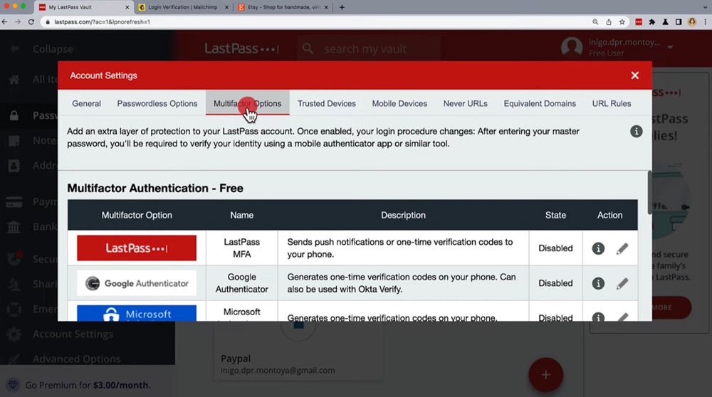 - In your Vault, go to “Account Settings,” then “Multifactor Options.”