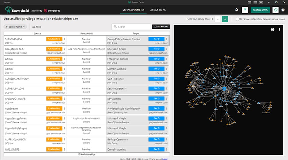 AD Forest inspection examines the connections between assets (data, devices, etc.), users (individuals, system functions, APIs, etc.), and groups (authorization categories). The examination focuses on Tier0 assets that can directly control the most secure levels of Active Directory and checks for excessive permissions and dangerous attack paths.